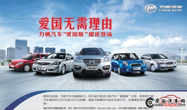 本次力帆汽車特別推出“愛國版”車型,包括力帆620、力帆520、力帆520i、力帆320和力帆X60在內的全部在售車型均屬優(yōu)惠范疇,加上這些車型中除力帆X60(1.8L排量)不在節(jié)能補貼名單之列,其他4款車型均可享受國家節(jié)能惠民補貼3000元,以驚爆實惠回饋廣大消費者。