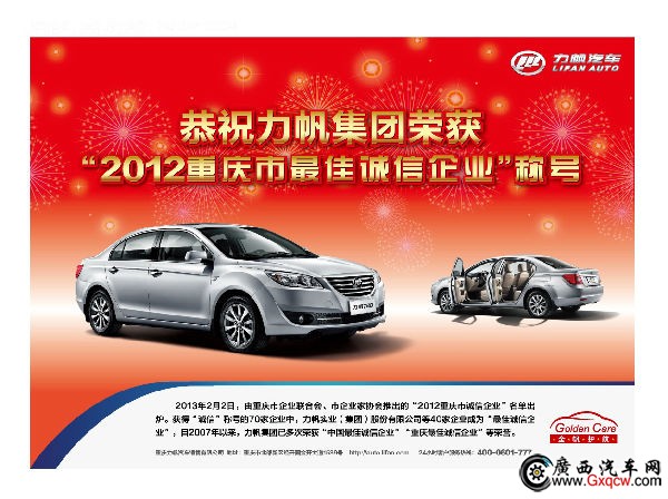 2013年2月2日,由重慶市企業(yè)聯(lián)合會.市企業(yè)家協(xié)會推出的“2012重慶市誠信企業(yè)”名單出爐。獲得“誠信”稱號的70家企業(yè)中,力帆實業(yè)(集團)股份有限公司等40家企業(yè)成為“**誠信企業(yè)”自己2007年以業(yè),力帆集團已多次榮獲“中國**誠信企業(yè)”“重慶**誠信”