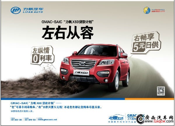 即日起,GMAC-SAIC為力帆X60推出一個左右從容的貸款計劃,即“左”可享0利率購車!坝摇笔枪┲灰5元!不論左右都讓您購車盡顯從容。