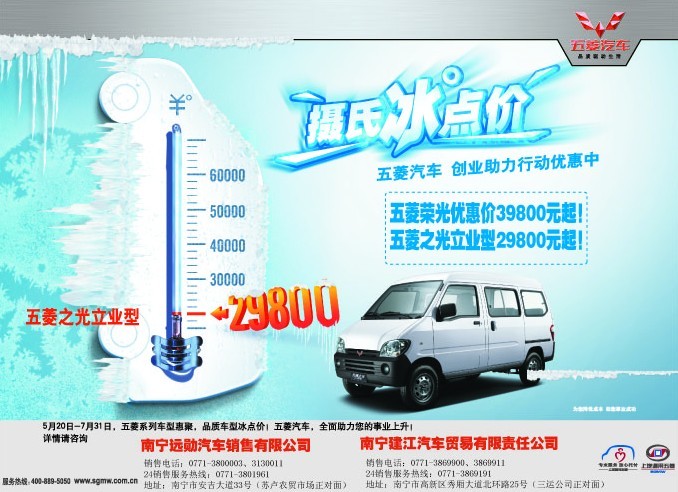 南寧遠勛6月舉辦五菱汽車攝氏冰點價,為你創(chuàng)業(yè)助上一臂之力。五菱榮光基本型最低39800元起;五菱之光立業(yè)型,最低29800元起;五菱宏光最低48800元起;五菱之光立業(yè)型(原色)28800元起!