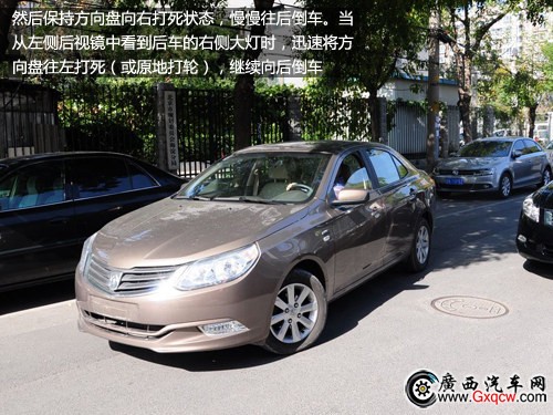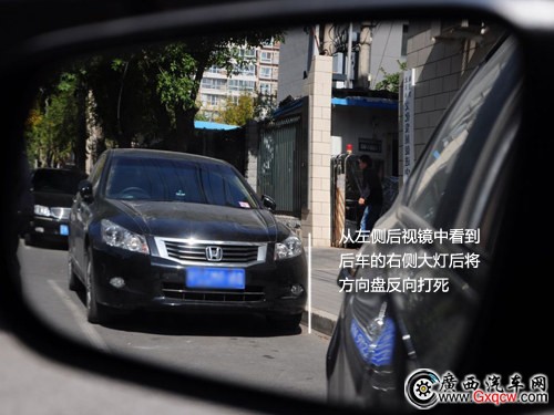 從左側(cè)后視鏡中看到后車右側(cè)大燈后將方向盤反向打死