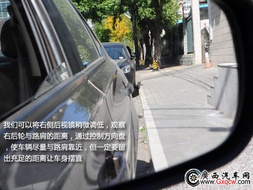 在此過程中,我們可以將右側(cè)后視鏡稍微調(diào)低,觀察右后輪與路肩的距離,通過控制方向盤,使車輛盡量與路肩靠近,但一定要留出充足的距離讓車身擺直。