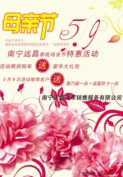 5月9日當天購車或進站維修的客戶均可免費獲得一份由南寧遠昌樂馳送出的母親節(jié)禮物,禮品有限,送完即止,歡迎大家加入!