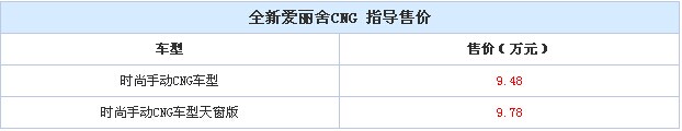 7月29日,東風(fēng)雪鐵龍官方宣布,旗下全新愛麗舍CNG車型正式上市,新車共有兩個(gè)版本分別為:時(shí)尚手動(dòng)CNG車型、時(shí)尚手動(dòng)CNG車型。其該車的售價(jià)分別為:9.48萬、9.78萬。據(jù)測算,全新愛麗舍CNG車型百公里可節(jié)省燃料費(fèi)40%以上,按照年行駛3萬公里計(jì)算,可節(jié)省費(fèi)用近7000元。具體售價(jià)詳見下表: