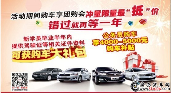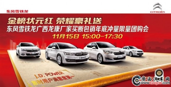 百年歷史品牌,成就法國總統(tǒng)座駕。歐系車品質,法蘭西的浪漫情懷。東風雪鐵龍榮登2014年J.D.POWER中國銷售滿意度指數研究榜首,值此榮耀時刻,2014年11月15日,東風雪鐵龍廣西龍康與廠家開展“東風雪鐵龍廠家買斷包銷年底沖量限量團購會”;顒悠陂g購車享團購會沖量限量最“抵”價,錯過就再等一年啦!趕緊撥打電話報名參加吧!0771-4853366