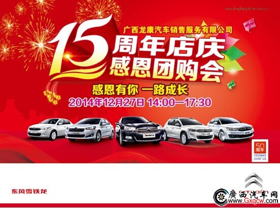 做為廣西東風(fēng)雪鐵龍首批龍騰4S店,廣西龍康汽車銷售服務(wù)有限公司成立至今已有15周年了!翱蛻魸M意”是我們龍康人的奮斗目標(biāo),并得到了廣大車友們的關(guān)注與支持。東風(fēng)雪鐵龍榮登2014年J.D.POWER中國銷售滿意度指數(shù)研究榜首,滿意是我們不斷追求的目標(biāo)!案卸饔心 一路成長”,2014年12月27日,東風(fēng)雪鐵龍廣西龍康特舉辦15周年店慶感恩團購會。活動期間購車享店慶團購會最“抵”價,另有七重豪禮送,錯過就再等15年啦!趕緊撥打電話報名參加吧!0771-4853366