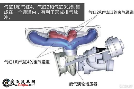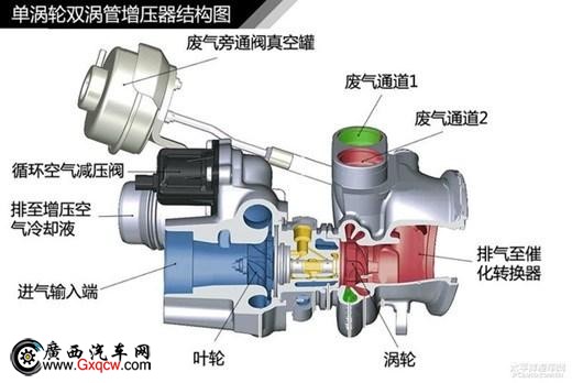 雙渦道單渦輪增壓原理就是這樣,一在原來渦輪增壓器的基礎(chǔ)上采用雙渦管設(shè)計(jì),將傳統(tǒng)的單渦管分為第1、4氣缸用A渦管和2、3缸用B渦管,這樣將進(jìn)入渦輪室的廢氣分為單獨(dú)的兩部分,從而避免了廢氣在渦管內(nèi)相互作用而造成的廢氣反竄損失,提高了廢氣推動(dòng)增壓器的效率。