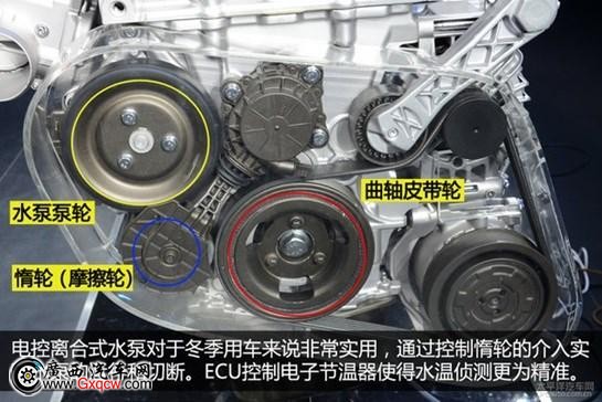 普通的水泵都是由皮帶帶動(dòng),曲軸轉(zhuǎn)它就轉(zhuǎn),但T時(shí)代新C5的1.6THP引擎水泵可以按需選擇接入與分離兩種模式。冷車啟動(dòng)時(shí),水泵與曲軸斷開連接,水泵停止工作,使發(fā)動(dòng)機(jī)快速暖機(jī)并降低油耗,水溫正常時(shí),水泵與曲軸連接,水泵正常工作。而電控節(jié)溫器則可以通過ECU控制節(jié)溫器,使水溫監(jiān)測(cè)更精確。