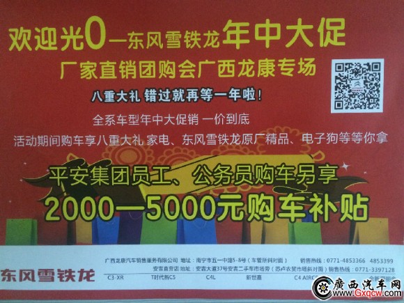 百年歷史品牌,成就法國(guó)總統(tǒng)座駕。歐系車(chē)品質(zhì),法式的浪漫情懷。東風(fēng)雪鐵龍榮登2014年J.D.POWER中國(guó)銷(xiāo)售滿意度指數(shù)研究榜首,2015年?yáng)|風(fēng)雪鐵龍首款SUV震撼上市,深受廣大消費(fèi)者關(guān)注……值此榮耀時(shí)刻,2015年6月27日,東風(fēng)雪鐵龍廣西龍康與廠家開(kāi)展“歡迎光0——東風(fēng)雪鐵龍年中大促?gòu)S家直銷(xiāo)團(tuán)購(gòu)會(huì)”;顒(dòng)期間購(gòu)車(chē)享團(tuán)購(gòu)會(huì)年中大促限量最“抵”價(jià),錯(cuò)過(guò)就再等一年啦!趕緊撥打電話報(bào)名參加吧!0771-4853366