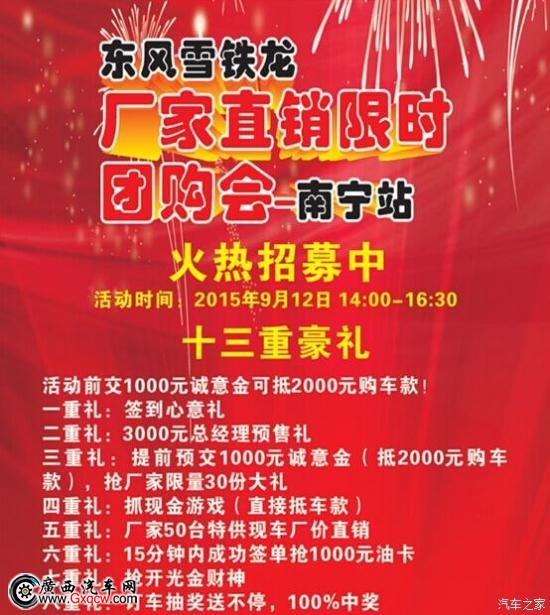 廠價(jià)風(fēng)暴 東風(fēng)雪鐵龍廠家直銷會(huì)——再次登陸南寧龍康店。廠家限量大禮,價(jià)格優(yōu)惠到廣告法不讓說,預(yù)交1000元誠意金抵2000元車款,活動(dòng)當(dāng)天除了能享受廠家直銷價(jià),更有十三重大禮搶奪回家。