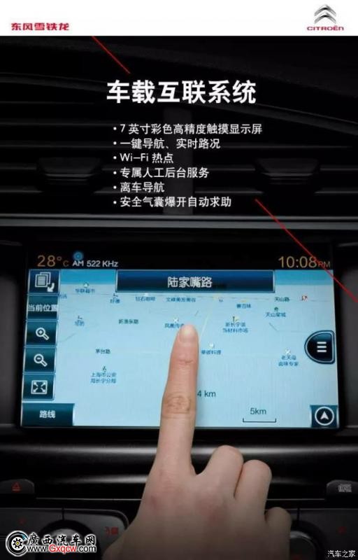 最方便快捷又無憂的方法來了!新C4L,搭載Citroen Connect車載互聯(lián)系統(tǒng)。迷路時(shí)按下車內(nèi)“I-CALL”鍵,即可連接呼叫中心,告知坐席你的目的地,坐席為您安排路線下發(fā)導(dǎo)航點(diǎn),即可實(shí)現(xiàn)導(dǎo)航。在停車后還可登錄手機(jī)客戶端打開離車導(dǎo)航,繼續(xù)步行導(dǎo)航至目的地。再也不用擔(dān)心你會迷路了~