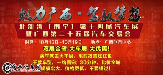 魅力廣西·駕馭夢(mèng)想-北部灣(南寧)第十四屆汽車展暨第二十五屆汽車交易會(huì)于10月16日-10月19日在廣西體育中心舉辦。東風(fēng)雪鐵龍廣西龍康力邀您參與車展大型團(tuán)購(gòu)活動(dòng)。 2015年10月16日至10月19日車展期間,憑購(gòu)車紅包在談妥價(jià)格后出示可在原優(yōu)惠基礎(chǔ)上再享受紅包優(yōu)惠!4~10萬(wàn)元車型——可優(yōu)惠300元;11~20萬(wàn)元車型——可優(yōu)惠500元;21萬(wàn)以上車型——可優(yōu)惠1000元。