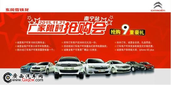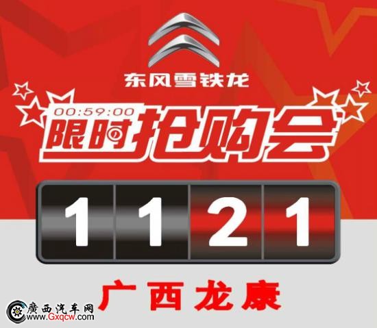 東風(fēng)雪鐵龍“限時搶購會”南寧站活動廣西龍康專場將在2015年11月21日舉行,廠家主辦,年度大促,錯過今次,再等一年! 采取臺階讓利模式,促銷讓利幅度不設(shè)上限。