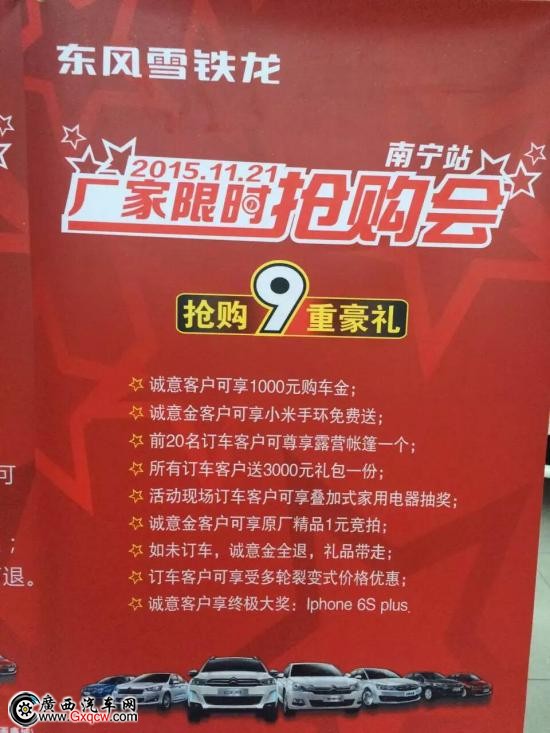 東風(fēng)雪鐵龍“限時(shí)搶購(gòu)會(huì)”南寧站活動(dòng)廣西龍康專(zhuān)場(chǎng)將在2015年11月21日舉行,廠家主辦,年度大促,錯(cuò)過(guò)今次,再等一年! 采取臺(tái)階讓利模式,促銷(xiāo)讓利幅度不設(shè)上限。