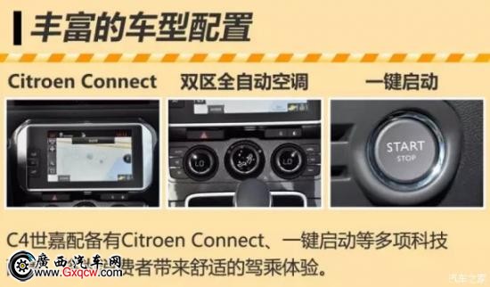 C4世嘉全系標配的7英寸彩色智能多媒體觸屏系統(tǒng),提供高清人性化界面,兼容各種多媒體格式。Citroen Connect車載互聯(lián)系統(tǒng)不僅具備五大智能模塊,還推出個性化的車載電臺。此外,雙區(qū)全自動空調(diào)、車內(nèi)空氣凈化系統(tǒng)、一鍵啟動/智能免鑰匙進入系統(tǒng)等科技配置,將為消費者帶來舒適、愉悅的駕乘體驗。此外在安全配置方面C4世嘉同樣可圈可點,Safeye盲區(qū)監(jiān)測及時到位,為消費者帶來全方位的呵護。全系標配的博世第九代電子穩(wěn)定系統(tǒng),集成8大主動安全配置,保障行車的穩(wěn)定和安全。