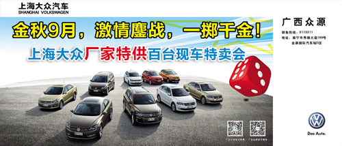 金秋九月,激情鏖戰(zhàn),一擲千金!9月3日至9月8日,上海大眾廣西眾源4S店現(xiàn)車特賣,廠家直供100臺特供現(xiàn)車,優(yōu)惠超越歷史幅度!凡活動期間于華南城車展廣西眾源展位或廣西眾源4S店購車的朋友,均可享受前所未有的活動優(yōu)惠價格!