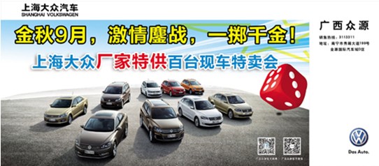 金秋九月,激情鏖戰(zhàn),一擲千金!9月7日至9月8日,上海大眾廣西眾源4S店現(xiàn)車特賣,廠家直供100臺特價現(xiàn)車,優(yōu)惠超越歷史幅度!凡活動期間到廣西眾源4S店購車的朋友,均可享受前所未有的活動優(yōu)惠價格!