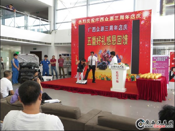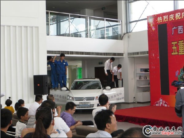 26日中午13:00活動(dòng)正式啟動(dòng),廣西眾源店付總經(jīng)理上臺(tái)致詞,感激各位車友三年來(lái)對(duì)眾源店的支持和陪伴。當(dāng)天最吸引人眼球的表演莫過(guò)于砸車燈的演示。主持人讓四個(gè)工作人員分別站在全新桑塔納的車門上,讓現(xiàn)場(chǎng)的客戶親眼見(jiàn)識(shí)到大眾汽車車身的堅(jiān)固品質(zhì)。隨后,講解人員讓售后技師拆下桑塔納車燈,并邀請(qǐng)市場(chǎng)部王總監(jiān)和現(xiàn)場(chǎng)客戶用錘子砸車燈,讓人們驚喜的是,有“小帕”之稱的新桑塔納沒(méi)有讓大家失望,在經(jīng)過(guò)大家猛勁砸過(guò)之后,依然完好無(wú)損,并且在售后技師把車燈再次安裝到車上后,“小帕”的眼睛又亮了起來(lái)。