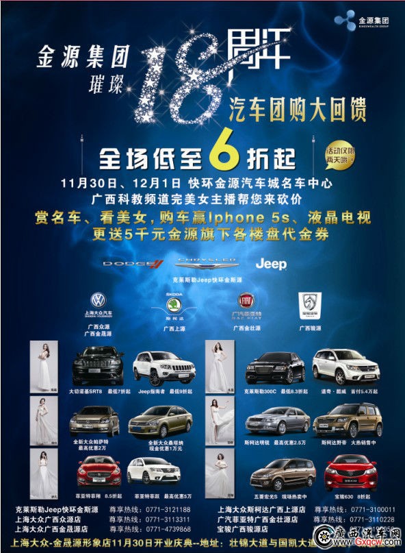 為答謝廣大用戶對(duì)金源集團(tuán)的長(zhǎng)期信賴與支持,在18周年之際,金源集團(tuán)特別推出了“金源集團(tuán)璀璨18周年汽車團(tuán)購(gòu)零利潤(rùn)大回饋”活動(dòng)!11月30日-12月1日(本周六、日),秀廂大道快環(huán)金源國(guó)際汽車城名車中心重磅上演!克萊斯勒、JEEP、道奇、上海大眾、上海大眾斯柯達(dá)、寶駿、五菱宏光、廣汽菲亞特等八大品牌購(gòu)車最低六折起!活動(dòng)現(xiàn)場(chǎng)還有廣西科教頻道完美女主播來(lái)助陣,買車有機(jī)會(huì)贏Iphone 5S、電冰箱!還送5000元金源旗下樓盤購(gòu)房券哦!賞名車、看美女!本年度*后一輪購(gòu)車狂潮盡在“金源集團(tuán)璀璨18周年汽車大團(tuán)購(gòu)”!詳情敬請(qǐng)致電0771-3113311。