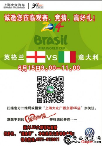即日起至6月14日,蒞臨秀廂大道199號金源國際汽車城D區(qū)——上海大眾廣西眾源展廳,即可參與2014巴西世界杯球賽英格蘭VS意大利比分競猜,并參與6月15日活動當天幸運抽獎環(huán)節(jié)贏取投影儀等大獎!