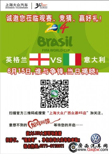 即日起至6月15日,掃描上海大眾廣西眾源微信二維碼并加關(guān)注,15日到店即可獲贈2014巴西世界杯吉祥物“福來哥”一個。