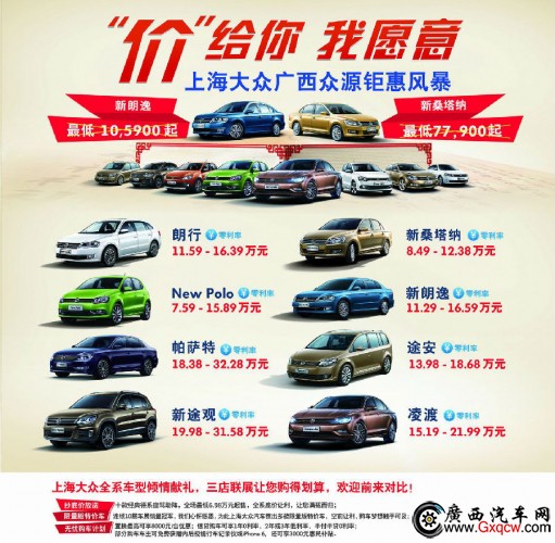 “價(jià)”給你,我愿意!上海大眾廣西眾源四月車展全系沖量,4月16-19日,上海大眾廣西眾源鉅惠無極限,價(jià)格擊穿底線,比車展優(yōu)惠更大,你敢來,我敢賣!車展參展費(fèi)讓利客戶,不去車展,16-19日車展期間,秀廂大道199號(hào)金源國際汽車城,我們廣西眾源展廳見!