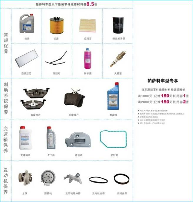 夏季活動(dòng)期間,帕薩特用戶購(gòu)買表中所列任意原裝零件,可享受以下優(yōu)惠