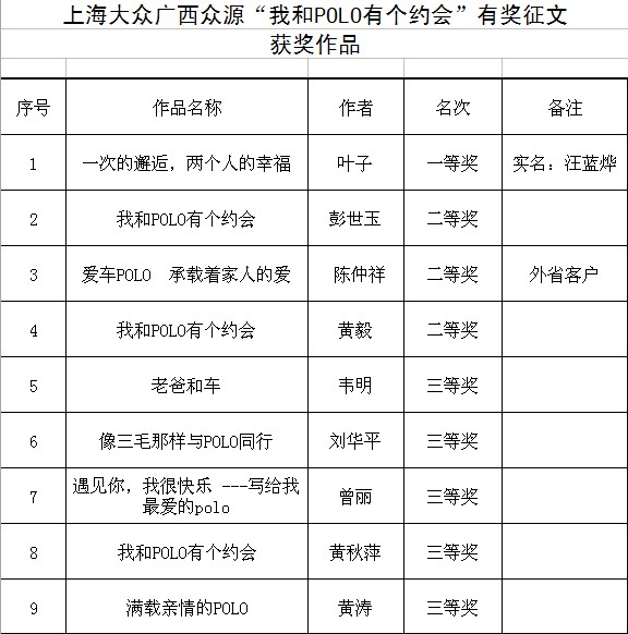 活動得到了廣大車主以及車友的支持。經(jīng)過一個多月的投稿時間,我們廣西眾源收到了近百份的征文稿件,每一份稿件都包含了各位車主和車友對我們POLO的喜愛。我們首先要感謝這些跟我們一起分享POLO車的一點(diǎn)一滴的車主和車友。經(jīng)過我們網(wǎng)絡(luò)投票以及客戶現(xiàn)場投票,本次“我和POLO有個約會”有獎?wù)魑幕顒拥贸隽俗罱K的結(jié)果。