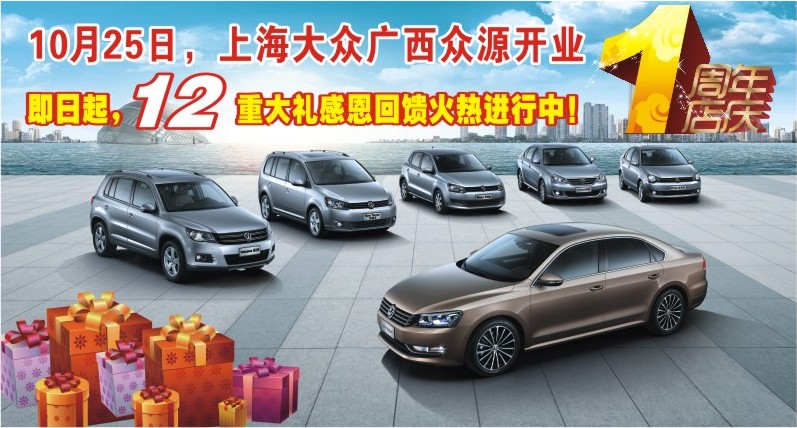 10月25日上海大眾廣西眾源開業(yè)一周年慶。開業(yè)一年以來,我們一步一個腳印走來,開業(yè)12個月一路有你同行,使我們不斷壯大。為答謝您12個月以來的一路相伴,上海大眾廣西眾源10月22日開展慶廣西眾源開業(yè)一周年,上海大眾廣西眾源“感恩盛惠”團購會。廣西眾源推出店慶車展特惠車。