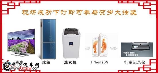 購(gòu)車幸運(yùn)禮:現(xiàn)場(chǎng)成功下訂即可參與賀歲大抽獎(jiǎng):IPhone6S、彩電、電冰箱、洗衣機(jī)、行車記錄儀等你來(lái)贏;