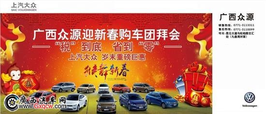 慶祝廣西眾源喬遷新址,喜迎猴年新春佳節(jié)!廣西眾源年前*后一場(chǎng)收官大作!活動(dòng)特獲金源集團(tuán)**特批,上汽大眾全系300臺(tái)現(xiàn)車資源新春直供;顒(dòng)報(bào)名正式啟動(dòng)!