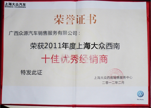 農(nóng)歷新年剛過(guò),喜訊接踵而來(lái)。我廣西眾源汽車銷售服務(wù)有限公司榮獲2011年度上海大眾西南“十佳優(yōu)秀經(jīng)銷商”的稱號(hào)。一分耕耘一分收獲,把我的真心放在您的手心,眾源與你一路同行!