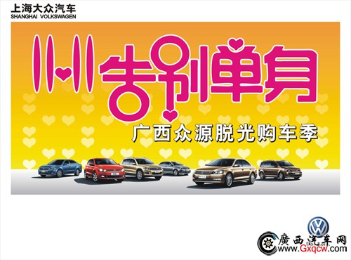 又到一年11.11時,你脫光了嗎?11月10-11日,蒞臨上海大眾廣西眾源4S店,超低特價現(xiàn)車,絕對有適合您的“小老婆”,數(shù)量有限,先訂先“脫光”喔!