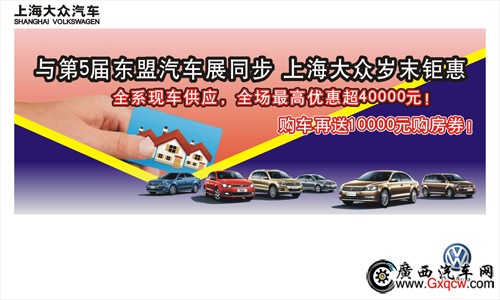 12月6日-10日,上海大眾廣西眾源攜上海大眾全系車型亮相2012第五屆中國-東盟國際汽車展13號館。車展期間親臨秀廂大道199號金源國際汽車城廣西眾源銷售展廳選車購車,*高尊享超4萬元鉅惠!