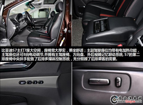 比亞迪S7雖然是一臺大中型7座SUV,但其舒適程度堪比MPV。S7的軸距為2730毫米,三排座椅以2+3+2的模式排列,座椅寬大厚實(shí),乘坐舒適;主副駕駛座位均帶有電加熱功能,主駕座位還可8向電動調(diào)節(jié),并擁有主駕座椅、方向盤、外后視鏡記憶聯(lián)動系統(tǒng), 該系統(tǒng)配有三組記憶功能,家庭不同成員駕車出行,不需要繁瑣的座椅、方向盤、后視鏡調(diào)節(jié)過程,便捷貼心。S7的第二排座椅可以單獨(dú)進(jìn)行前后和靠背角度的調(diào)節(jié),還配備了后排多媒體控制系統(tǒng),可控制空調(diào)和音響,調(diào)節(jié)空調(diào)溫度和切換歌曲再也不用麻煩司機(jī)幫忙了,充分照顧了后排乘客的需要。