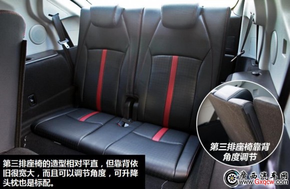 第三排座椅為*大亮點(diǎn),造型相對平直,不過靠背本身寬大舒適,而且可以調(diào)角度,頭枕可升降。要進(jìn)入第三排時(shí),乘客只需要通過第二排右邊椅背上的扣手把座椅放倒然后通過靠背后方的拉繩將整個(gè)座椅向前折疊,就能順利進(jìn)入第三排座椅。實(shí)際體驗(yàn)很便捷,空間足夠成年人進(jìn)出?臻g方面,第三排坐著還是挺舒服的,靠背的傾斜角度也讓人覺得剛剛好,頭部空間也很寬敞,而且S7還為第三排乘客設(shè)置了杯托和側(cè)面積較大的窗戶。如無人乘坐的情況下,S7的第三排座椅可以完全折疊放平,形成一個(gè)較大的后備箱空間,貼心的設(shè)計(jì)值得點(diǎn)贊。