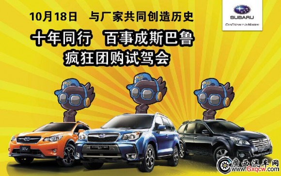 2014年,斯巴魯進(jìn)入中國十周年,同時(shí)百事成已服務(wù)廣西斯巴魯客戶十年。10月18日,斯巴魯全國巡回瘋狂團(tuán)購試駕會-南寧站,報(bào)名參與深度試駕廠家大型專業(yè)器械,購車享受百事成斯巴魯攜手廠家創(chuàng)造的團(tuán)購價(jià)格新低。這一天,十年老店百事成斯巴魯將與廠家共同創(chuàng)造歷史。