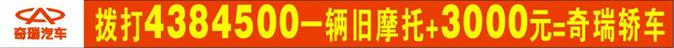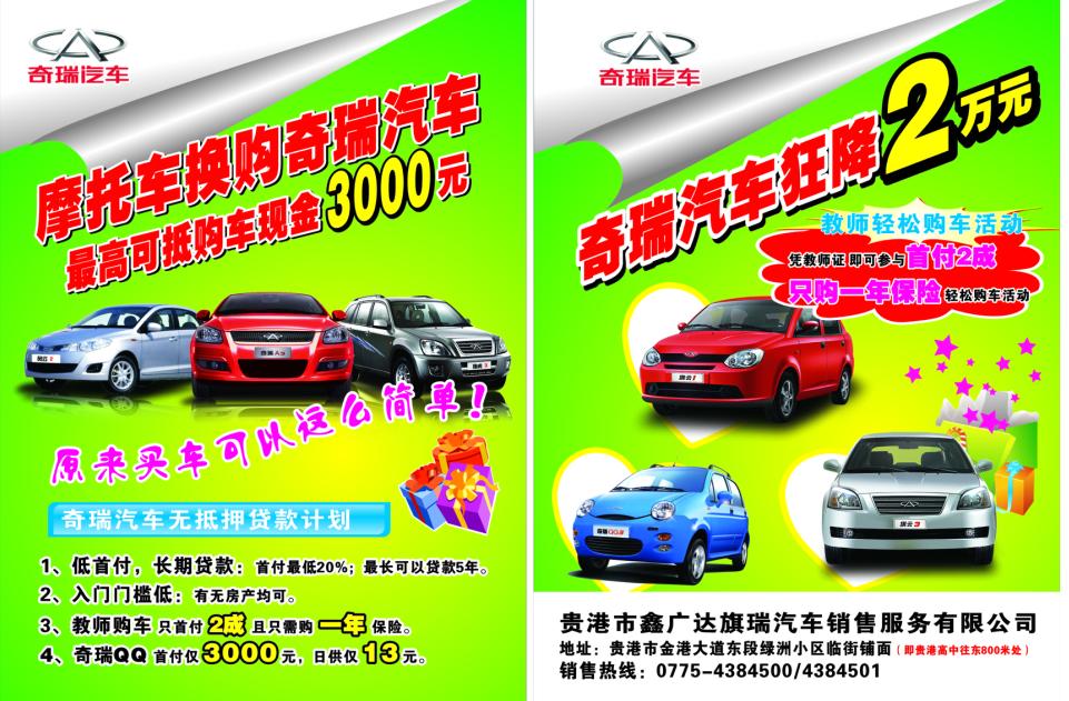 即日起,擁有合法牌照摩托車(chē)在貴港鑫廣達(dá)奇瑞店可為您折換購(gòu)車(chē)現(xiàn)金(根據(jù)摩托車(chē)狀況,比市場(chǎng)價(jià)高出500元)!且只交3000元就可以擁有一輛奇瑞汽車(chē)!趕快行動(dòng)吧。