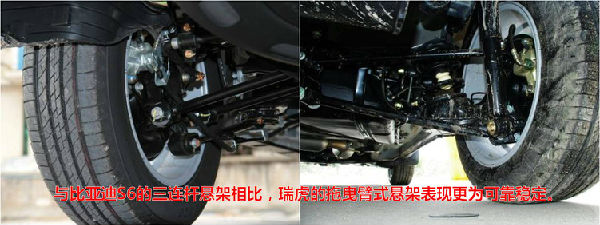 除了發(fā)動機(jī)上的差異,瑞虎與S6在懸架的選擇上也各有不同。瑞虎采用的是前麥弗遜后拖曳臂半獨(dú)立式懸架,為減少車輛在轉(zhuǎn)彎時(shí)的側(cè)傾幅度,還特意加入穩(wěn)定桿輔以幫助。同時(shí)經(jīng)英國蓮花公司調(diào)校后,瑞虎的底盤明顯更偏向歐系車風(fēng)格。干脆直接的路面反饋比起S6較為模糊的感覺,讓人更清楚操控的極限所在。