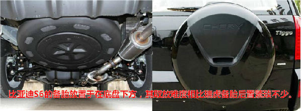 除了尺寸上的差異,在備胎的放置上瑞虎與S6也大相徑庭。為了追求后備箱地板的平整,比亞迪S6沒有將備胎放置于車內(nèi),而是其挪至車尾底盤下方。這樣不僅更換時(shí)非常困難,也容易造成備胎丟失。相比瑞虎的備胎后置方法,S6似乎在細(xì)節(jié)設(shè)計(jì)上還欠缺考慮。而且上掀式的尾門對于身材不高的女士而言,多少會造成使用上的一定困難,不如瑞虎的側(cè)開門使用的方便。