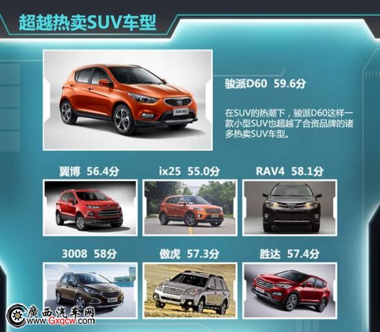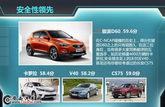 在C-NCAP碰撞的歷史上,得分在駿派D60之上的只有觀致3。在這二位身后,也有很多大家耳熟能詳?shù)奈逍沁x手,如歷史銷量4000萬輛的卡羅拉,安全理念至上的沃爾沃V40,甚至還有你曾經(jīng)考慮過的長(zhǎng)安CS75。在SUV的熱潮下,駿派D60這樣一款小型SUV也超越了合資品牌的諸多熱賣SUV車型。如小型SUV長(zhǎng)安福特翼博,得分56.4分。北京現(xiàn)代ix25,得分55分。緊湊型SUV一汽豐田RAV4,得分58.1分。東風(fēng)標(biāo)致3008,得分58分。中型SUV斯巴魯傲虎,得分57.3分。北京現(xiàn)代勝達(dá),得分57.4分。