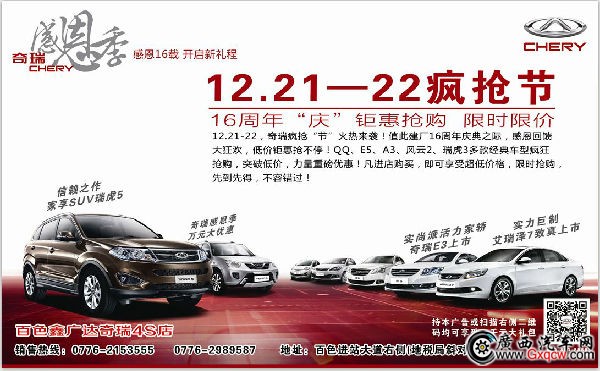 奇瑞感恩季,12月21-22日瘋搶“節(jié)”,閃購大掃蕩!奇瑞16周年廠慶底價狂潮,鉅惠來襲!5款車型共襄盛惠!