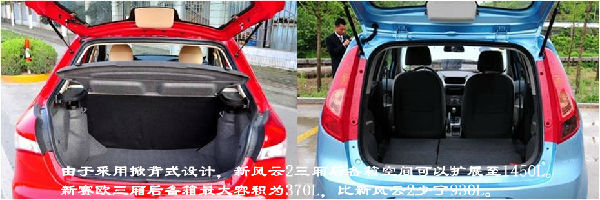 空間方面,新風(fēng)云2憑借2527mm的軸距,已接近A級車水準;而賽歐2465mm的軸距設(shè)計則沿襲了A0級普遍的長度標準,在日常使用中,后排空間的局促感就很明顯了。后備廂空間,兩者的基礎(chǔ)數(shù)值都為370L,在同級別中擁有較明顯的優(yōu)勢,不過令人驚喜的是,新風(fēng)云2采用的掀背式后設(shè)計,后排座椅放倒后,能夠擴展成1450L巨大而平坦的儲物空間,實用性則明顯高于賽歐。