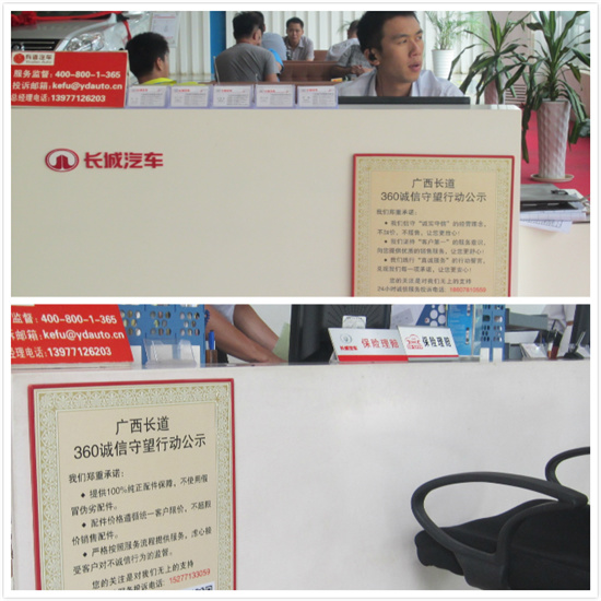 為響應(yīng)長(zhǎng)城汽車對(duì)消費(fèi)者負(fù)責(zé)的號(hào)召,廣西長(zhǎng)道長(zhǎng)城汽車4S店,本著“以誠(chéng)信為本,以顧客為本”,“買放心車,買實(shí)惠車,買品質(zhì)車”的理念,真誠(chéng)為顧客服務(wù)。為了更好推進(jìn)誠(chéng)信經(jīng)營(yíng),打造“天天誠(chéng)信”的終端氛圍,廣西長(zhǎng)道將“360誠(chéng)信守望行動(dòng)”進(jìn)行到底。