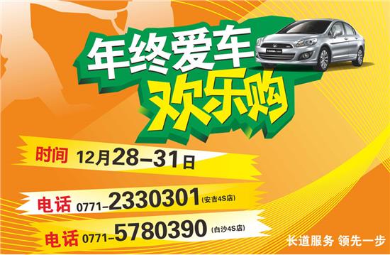 在佳節(jié)來(lái)臨之際,廣西長(zhǎng)道讓你輕松提愛(ài)車回家過(guò)年!廣西長(zhǎng)道歲末年底沖刺跑又開(kāi)始了,2013年12月28日至12月31日廣西長(zhǎng)道“年終愛(ài)車歡樂(lè)購(gòu)”團(tuán)購(gòu)會(huì)火熱進(jìn)行中!您不用擔(dān)心買得比別人高價(jià),拿得比別人少。廣西長(zhǎng)道讓您優(yōu)惠享不停,更有多重豐厚豪禮。新春購(gòu)車好契機(jī),買現(xiàn)車,過(guò)大年,走親訪友喜無(wú)憂。錯(cuò)過(guò)了今年還得等一年。馬上報(bào)名!提前預(yù)約吧!廣西長(zhǎng)道服務(wù)熱線:安吉高速路口4S店(0771-2330308);(0771-3922501);白沙亭江立交4S旗艦店:(0771-5780980)。我們將竭誠(chéng)為您服務(wù)!