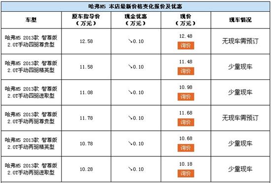2013款哈弗H5智尊版新車匹配6MT變速箱,有兩驅、四驅可選。售價區(qū)間為9.48萬-12.38萬。