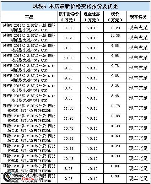 近日,廣西長(zhǎng)道汽車店內(nèi)風(fēng)駿5現(xiàn)車銷售,顏色可選,目前購車部分車型可優(yōu)惠1000元,感興趣的朋友可以到店咨詢購買,詳情見下表: