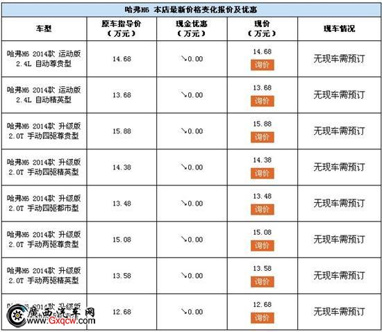 近日,廣西長道汽車店內(nèi)哈弗H6現(xiàn)車銷售,顏色可選,目前無優(yōu)惠,購車送豪華禮包。感興趣的朋友可以到店咨詢購買,詳情見下表