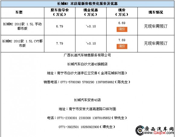 近日,廣西長道汽車店內(nèi)長城M2現(xiàn)車銷售,顏色可選,目前購車部分車型可優(yōu)惠1000元,送豪華禮包。感興趣的朋友可以到店咨詢購買,以下報價未含運費,如最終購車需加500元運費。詳情見下表: