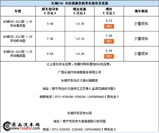促銷時間:2014.03.18-2014.03.31 長城C50長城汽車主推的T動力家轎,三月春游就選它。1.5T渦輪增壓發(fā)動機強勁的動力、優(yōu)秀的外觀設(shè)計。車內(nèi)大空間,家用首選。廣西長道周末開展長城特惠活動。長城C50*高優(yōu)惠2500元!詳情咨詢:0771-2330301。
